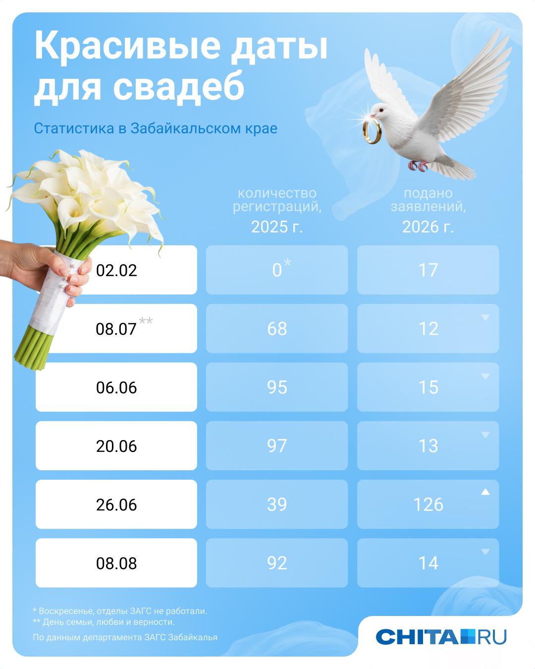 Департамент ЗАГС Забайкальского края сообщил об активной подаче заявлений на бракосочетание в символичные дни будущего года.