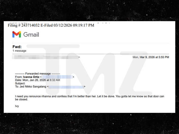 По данным судебных документов, Джед Вальдес Сангаланг приложил электронное письмо, которое, как он утверждает, Иванна Ортис отправила ему 26 января. В нём она требовала: «Мне нужно, чтобы ты отрёкся от Рианны и признал, что я лучше неё. Пусть это будет сделано. Ты должен дать мне знать, чтобы эту дверь можно было закрыть».